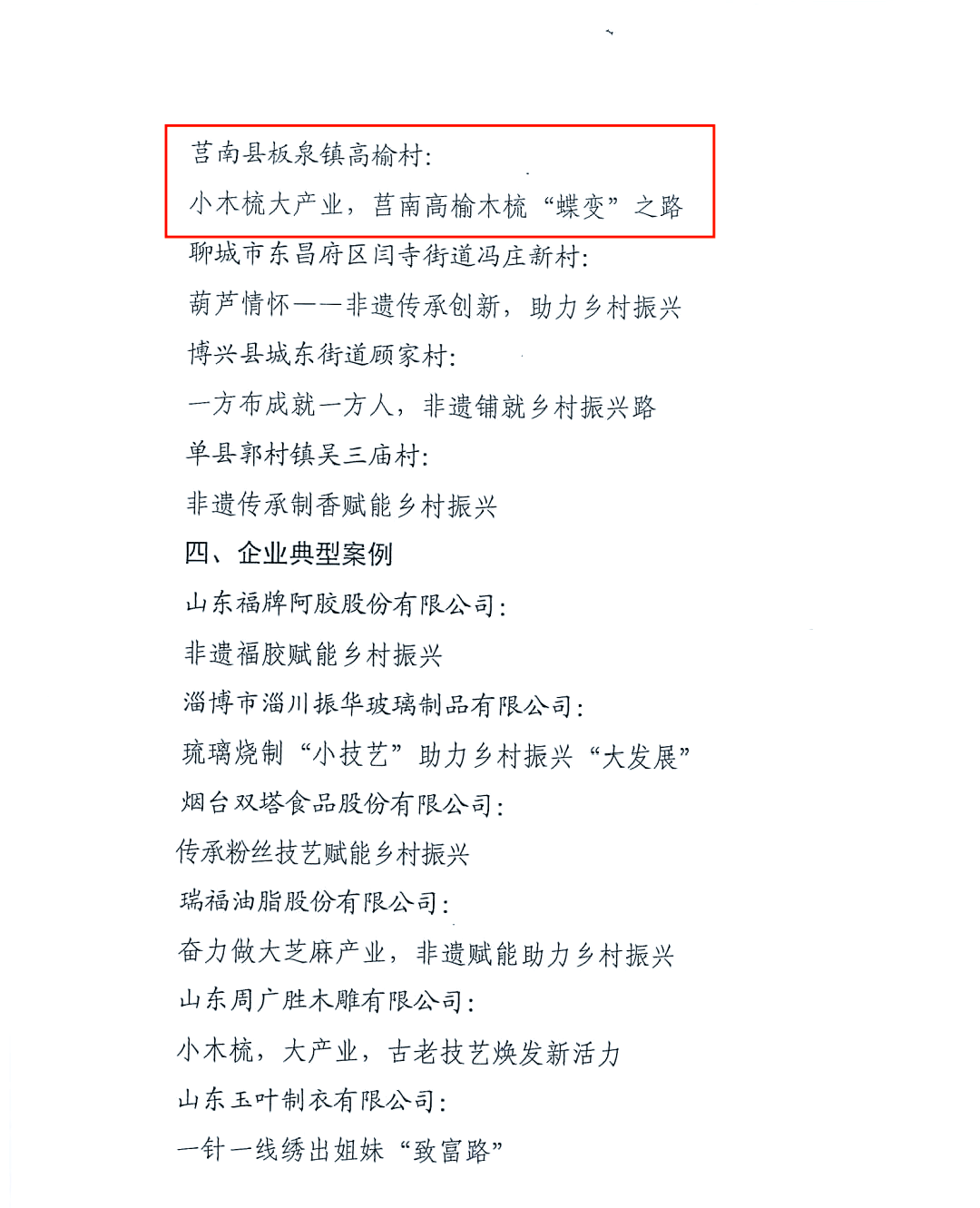 近日,山东省文化和旅游厅揭晓了首批全省非遗助力乡村振兴的典型案例。《小木梳大产业,莒南高榆木梳“蝶变”之路》这一案例,凭借其独特的非遗魅力和对乡村振兴的积极贡献,成功脱颖而出,荣获了这一殊荣。